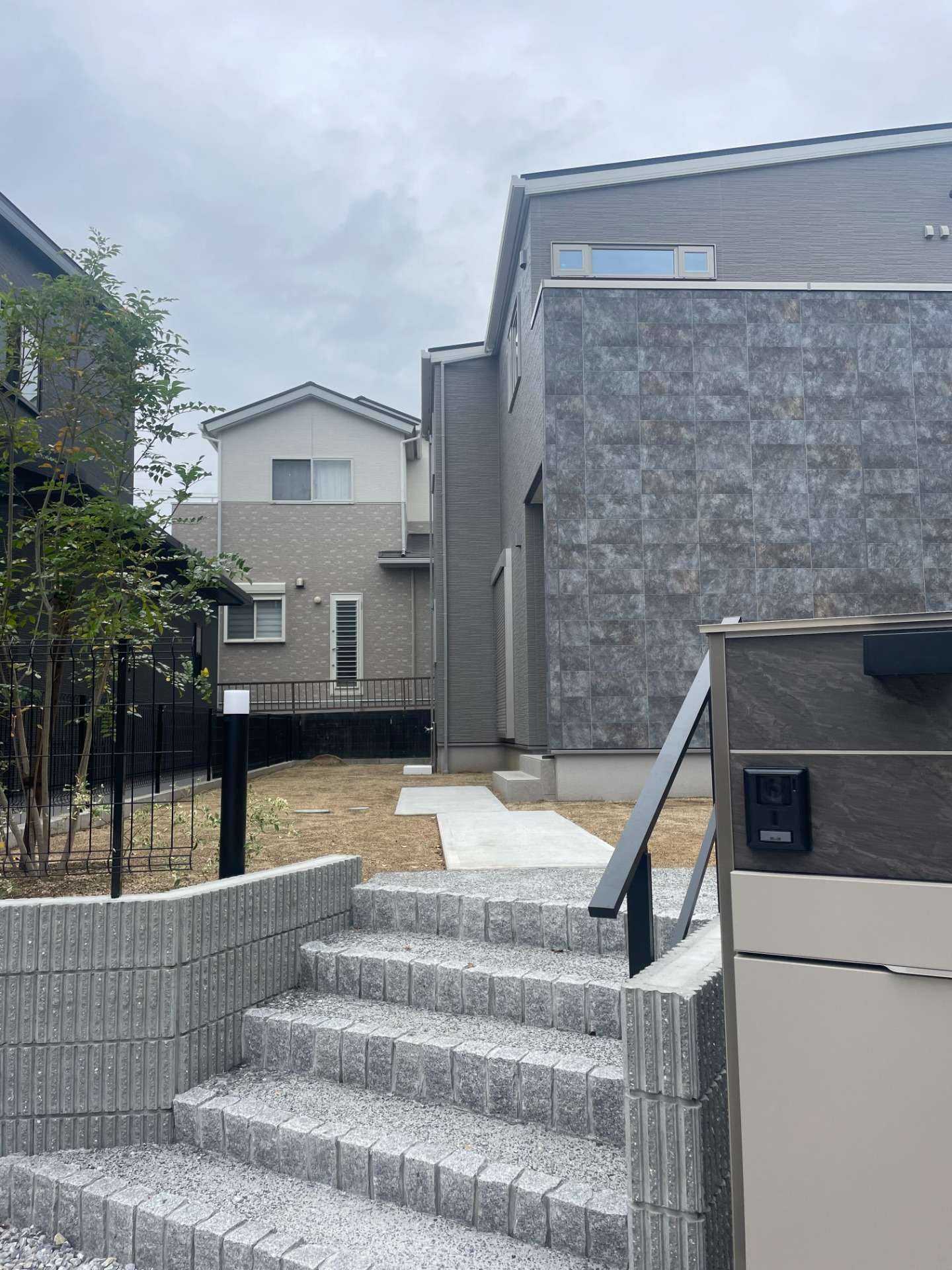 階段は、蹴上がりを2丁掛けピンコロ、踏み面は一発洗い出し仕上げです。駐車スペースは土間コンクリートと一発洗い出しの組み合わせです。表札・ポスト・インターホン・マストアイテムになりつつある宅配ポストが一体化した多種多様な機能門柱が人気です。気になる方は、是非お問い合わせください。