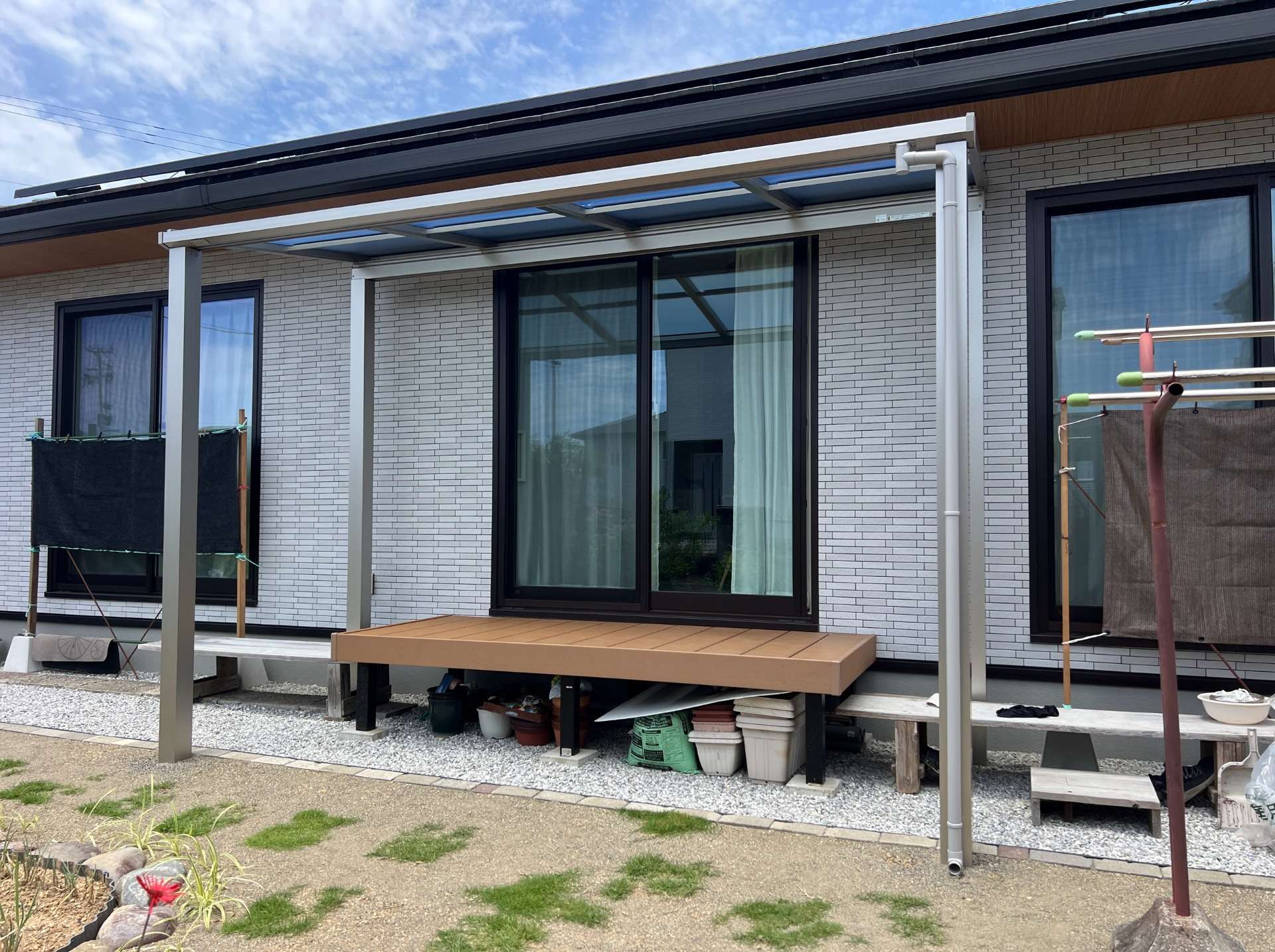テラス屋根を付けたいけど・・。建物には直接つけたくない。とのご希望でした。そこで、独立納まりタイプ・ソラリア(YKK)を御提案させて頂きました。取付場所・設置目的・取付方法に応じて選ぶことができる商品です。