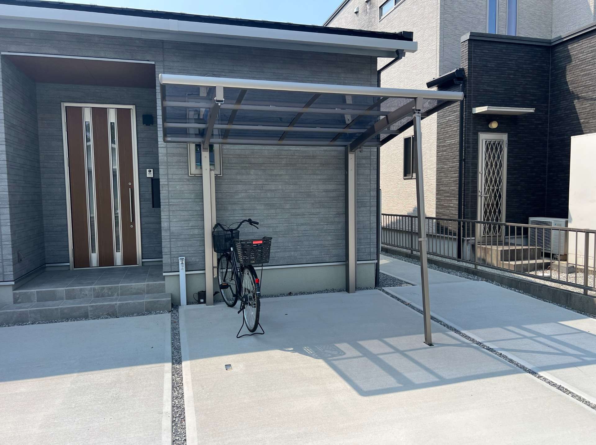 暮らしの中の動線は、各ご家庭様々です。自転車に乗る機会が多い方は、玄関横に駐輪場があると便利ですよね。ついつい車の配置を優先して考えてしまいますが、2輪車を主に移動手段に考えている方は、ガレージ&駐輪場の配置場所は大切です。使い勝手の良い外構が、完成しました。