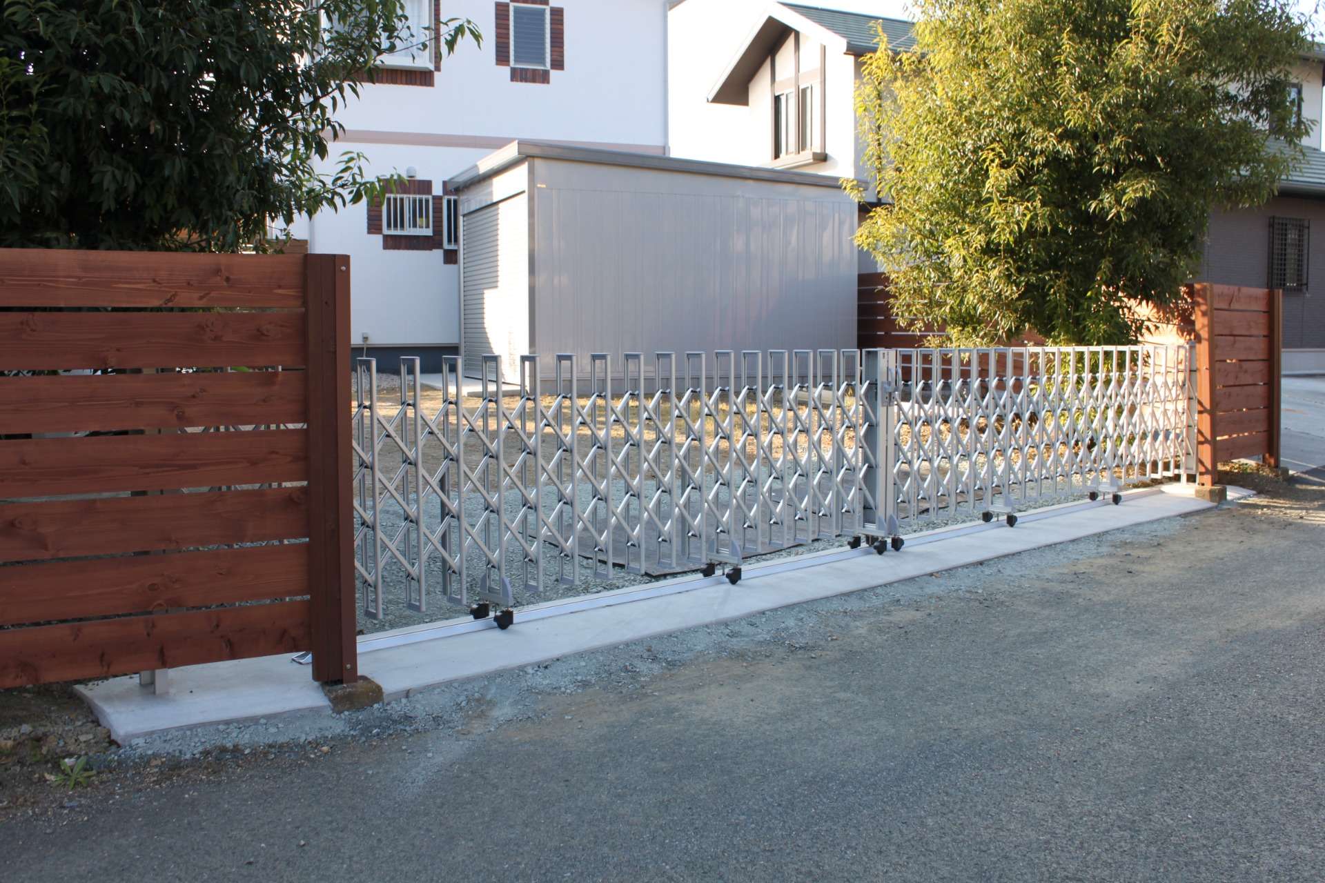 伸縮門扉:レイオス1型42-42W(YKK) ガレージ:ガレーディア(イナバ物置)