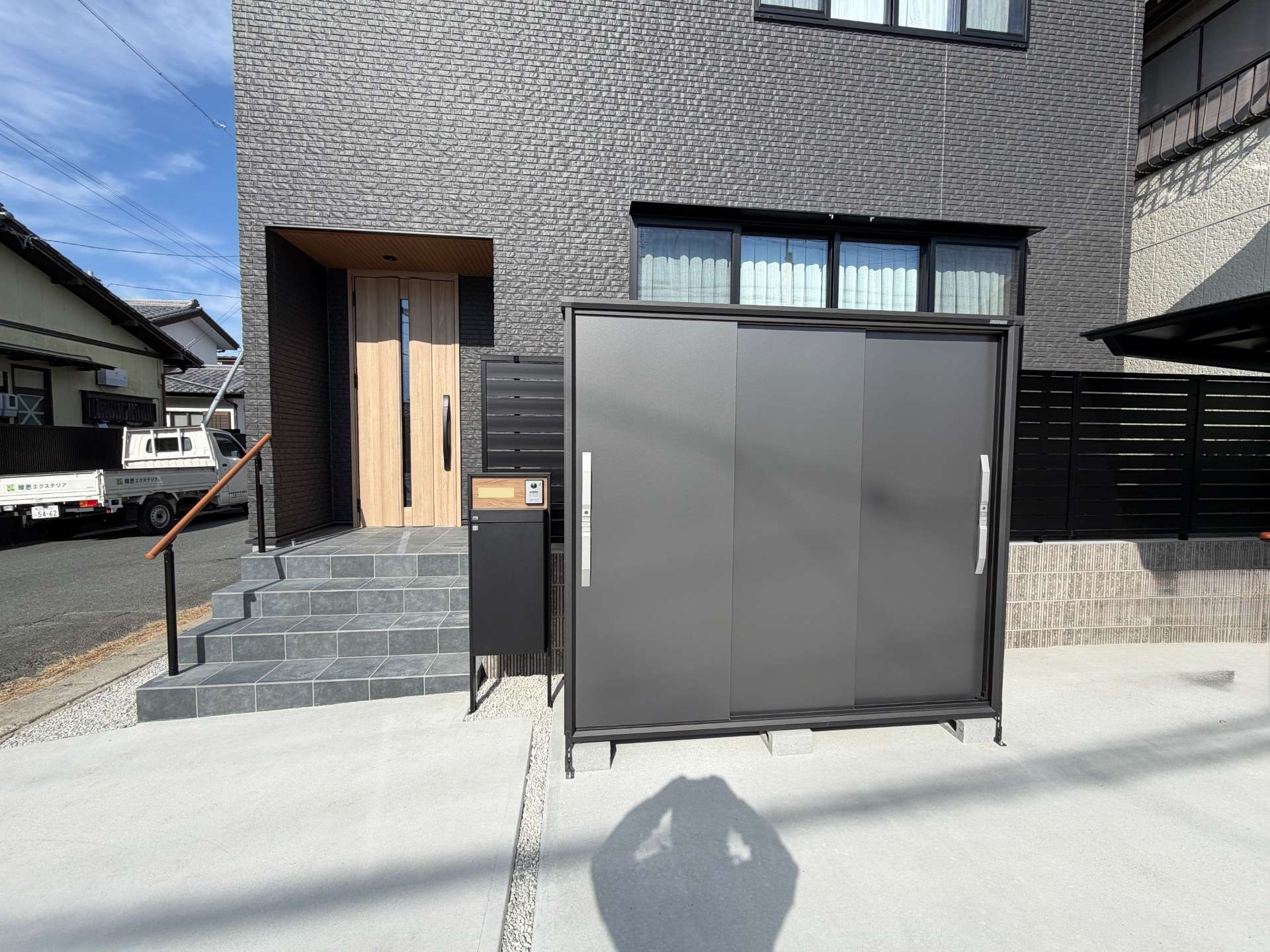 ブラックで統一した外構工事です。物置も、本体色をブラックにしたことで、玄関横に設置しても違和感がありません。所々に木調色を入れることで、より一層建物と調和した外構となりました。