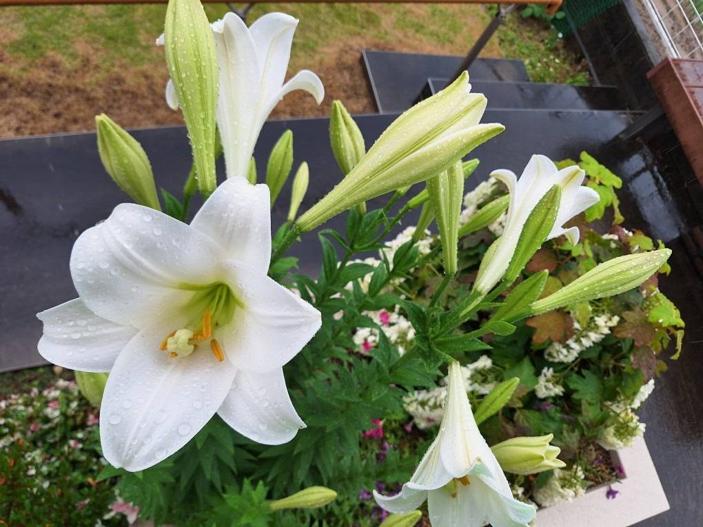 名前に鉄砲ってはいっているけど、花言葉は「純潔・威厳・甘美」。雨に負けず、この時期、アジサイに負けない存在感で咲き誇ってます!株でどんどん増えるので、毎年の楽しみになりますよ♪