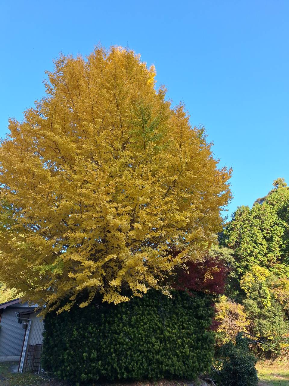 この日は雲一つない青空。引佐の畑へ里芋を掘りに行って出会いました。青空に堂々とした風格。歴史を感じます。野生動物が臭いを嫌がり種子を食べずに避けるために、イチョウは子孫を守りぬいてきた「生きた化石」といえるのでしょうね。大きくなりすぎるから、庭木には向かない・・・かな。でもきれいな黄色に憧れます。